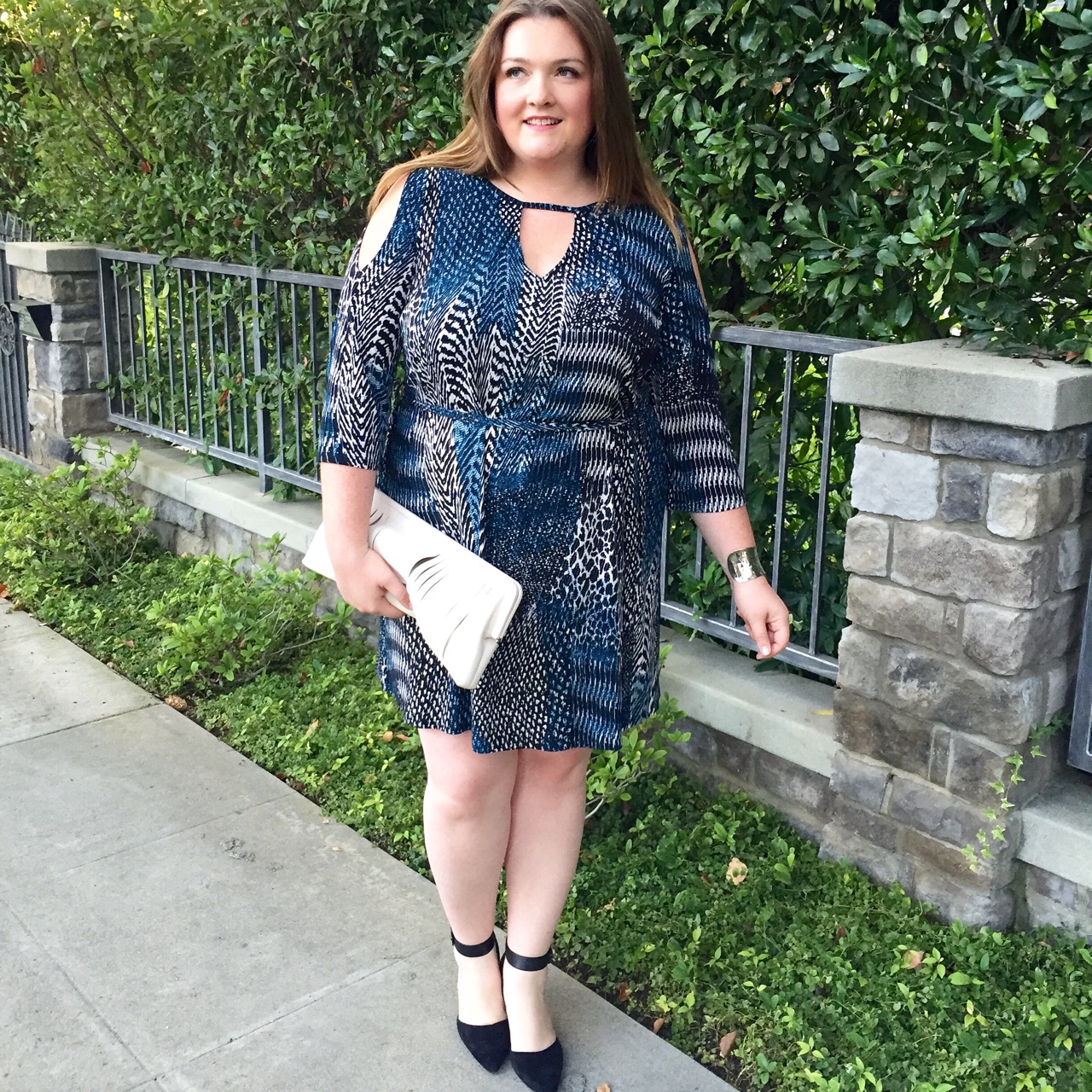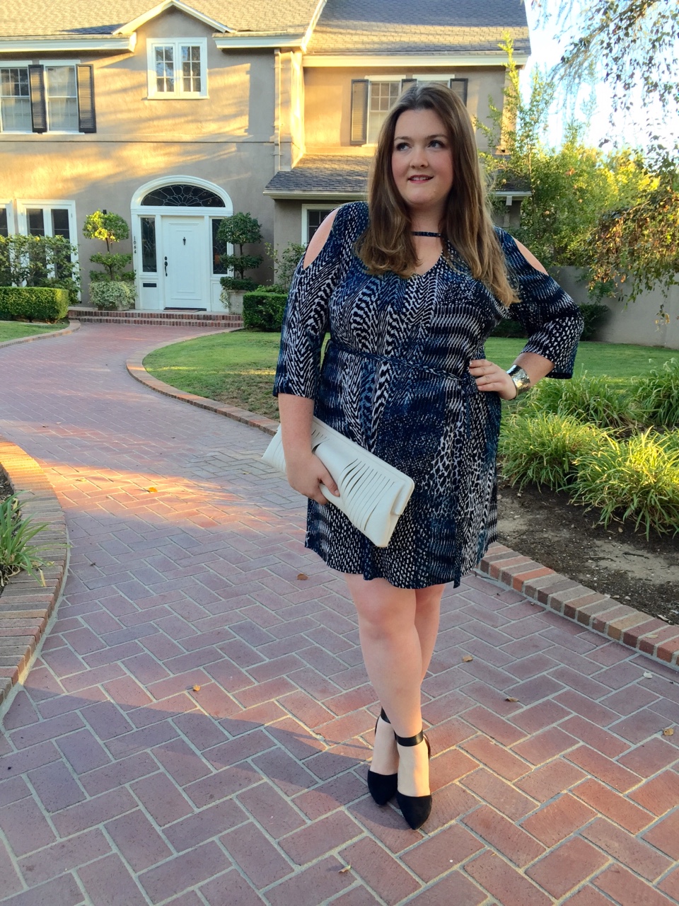 I’m trying my best to get into Fall clothes but it’s a little hard when LA weather just doesn’t want me to! However when I saw this dress from Anna Scholz I had to try it! The silhouette is a good one for me and I loved the print and cold shoulder detail. I paired it with my new favorite cream clutch from BCBG and black pumps from Sam Edelman.