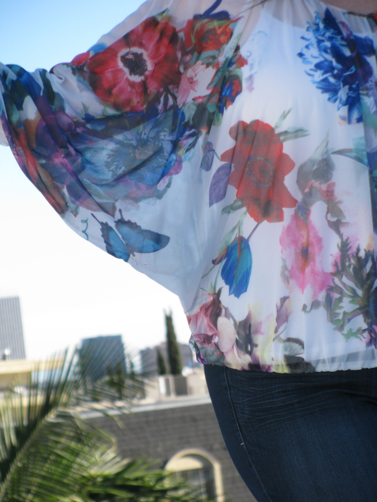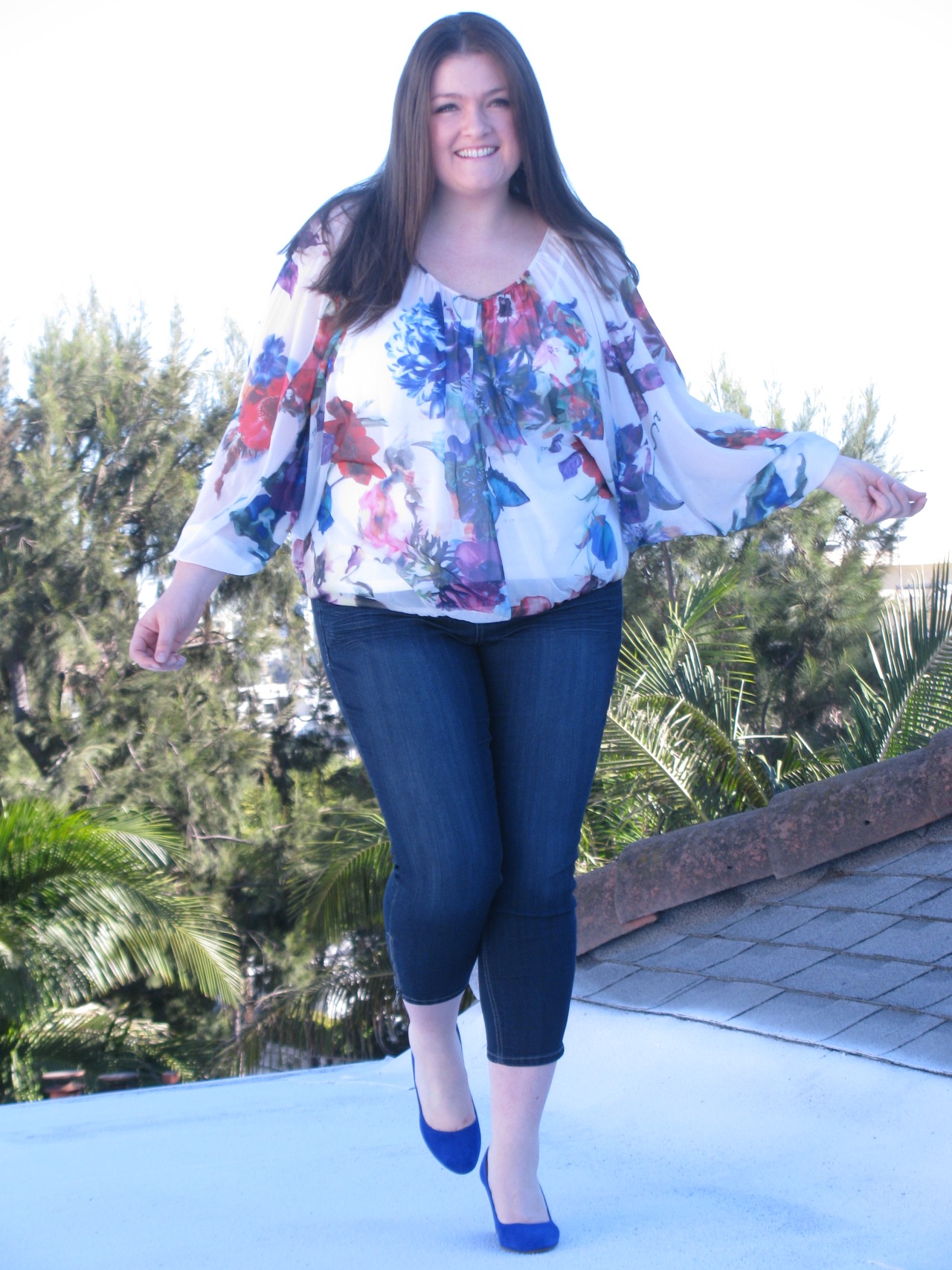 Let me just start out by saying that I rarely wear loose, fitted, flowy, bloussant type blouses since I feel like a lot of them make you look much bigger than you really are. I believe in the power of wraps, layers and fitted tops that give you shape versus hiding your shape. However, I was out shopping, styling a friend of mine on a budget when I discovered this top at JCPenney aka “J Couture”. I had recently purchased some royal blue wedges from JCREW and knew I could rock this top with my Torrid Ankle Zip Stiletto Jeans. The recent LA “heatwave” had me feeling extra colorful and I threw in my red leather embossed clutch from Top Shop that I purchased on my trip to London last year.