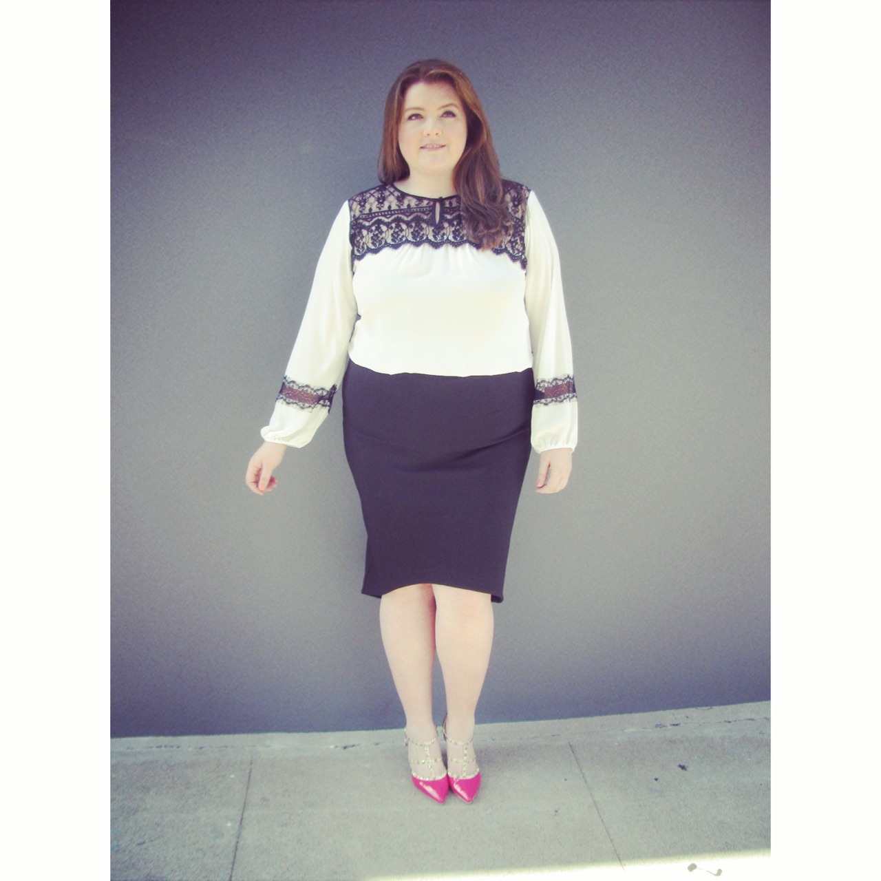 I paired this gorgeous black lace and white blouse with my skirt from the Christine Kardashian Collection and heels from Torrid. You can buy the Gemma blouse at Sak’s Fifth Ave, and the cutaway pencil skirt at Christine Kardashian.